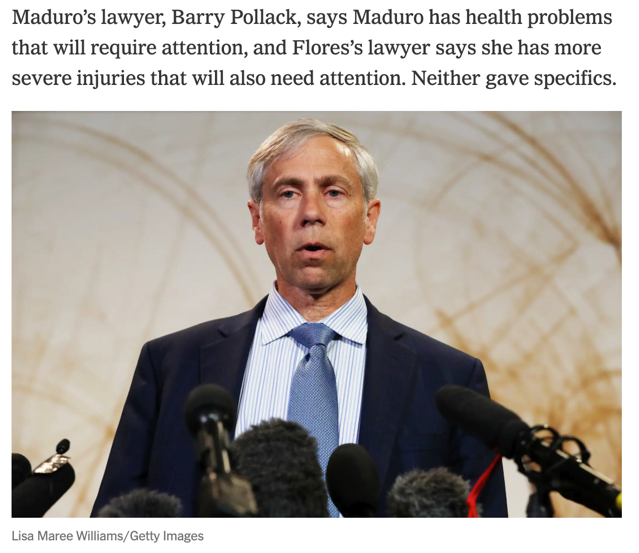 马杜罗的辩护律师是巴里·波拉克,他在美国联邦刑事辩护界拥有长期丰富经验,曾代表过包括维基解密创始人阿桑奇在内的高关注度案件。他表示,将围绕“国家元首豁免权”以及被强行控制的合法性提出法律挑战。